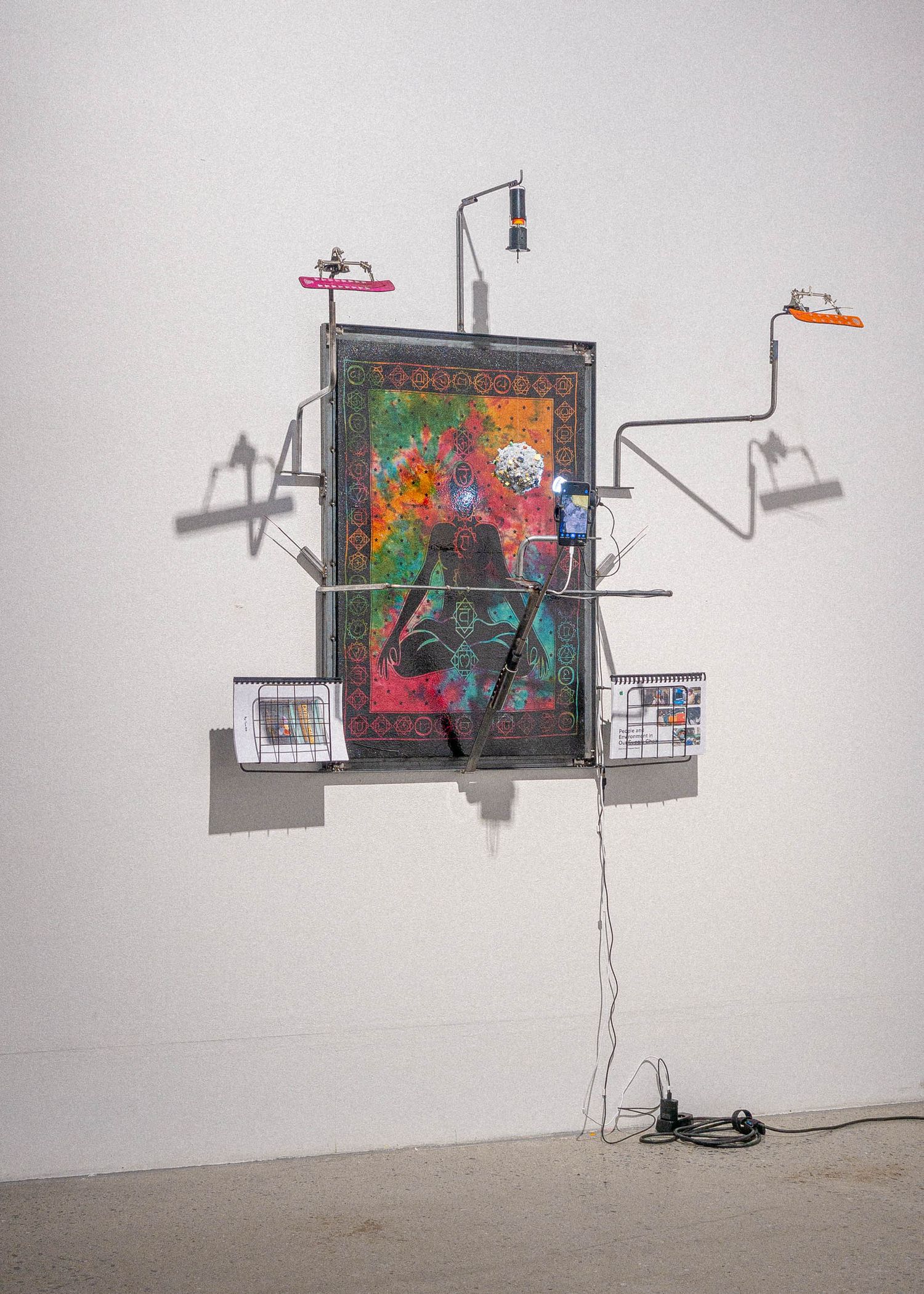 THE Selfie and a portrait of Steve Jobs, 2023 Resin coated textile, steel, Apple supplier catalouge, new age catalouge, disco ball motor, iPhone, digital microscope, all minerals needed to make an iPhone.