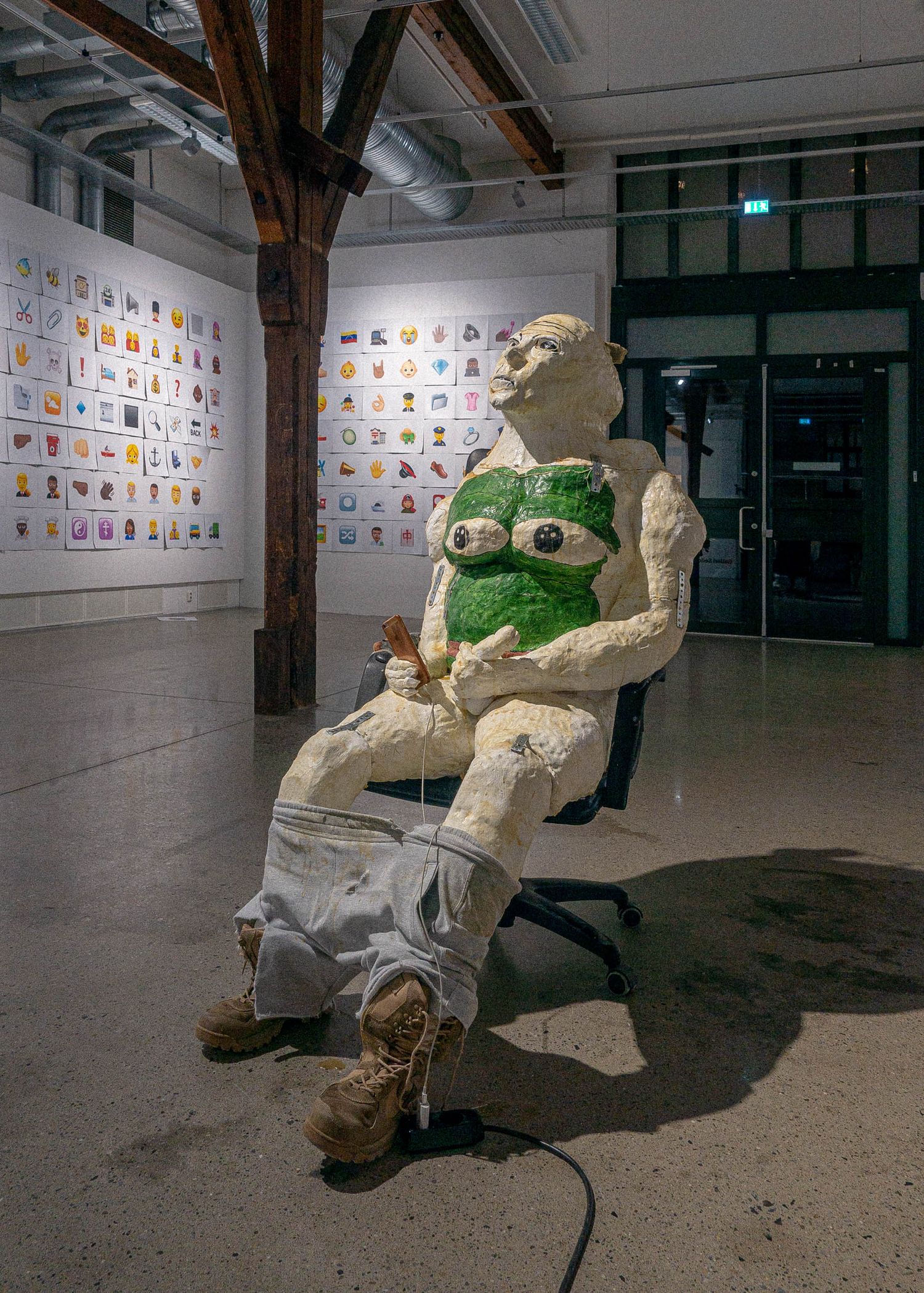El tio, 2023 Painted ceramic, iPhone, army boots, sweat pants, gaming chair, Monster soda, pvc pipe